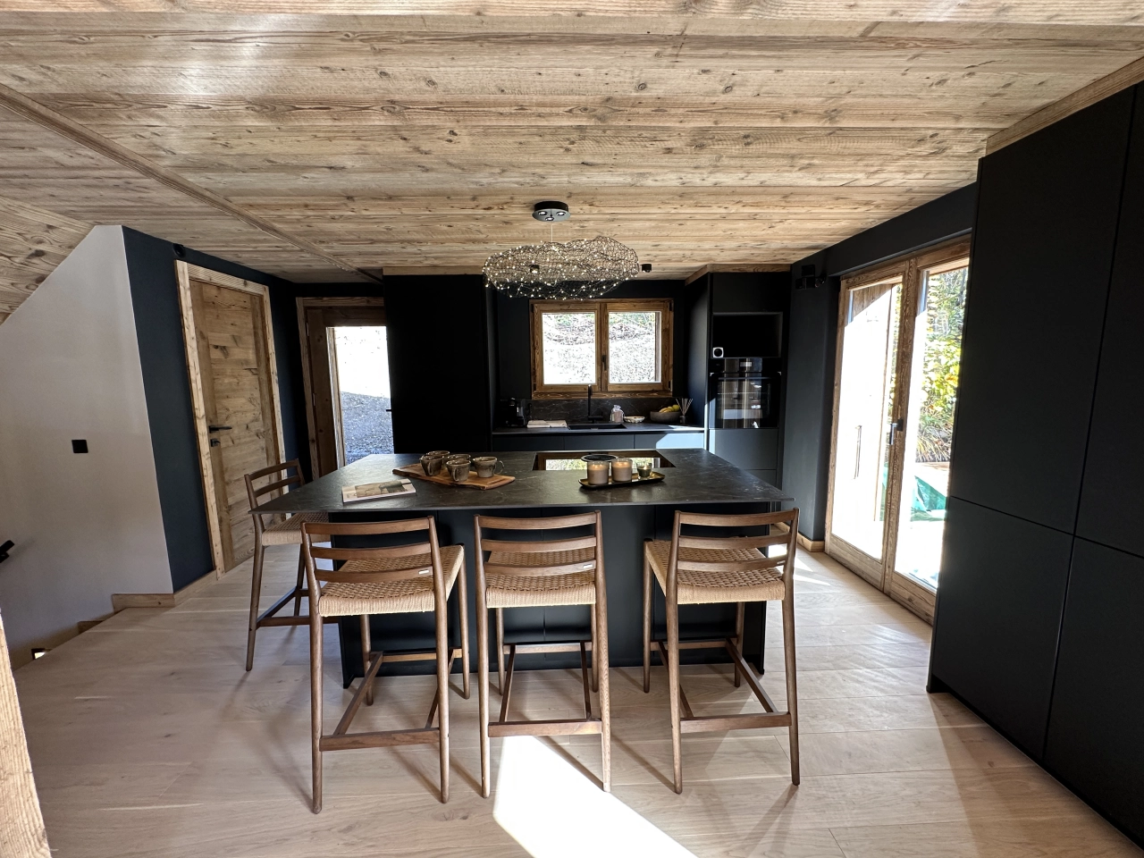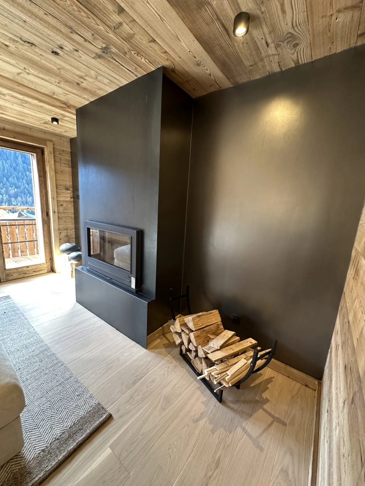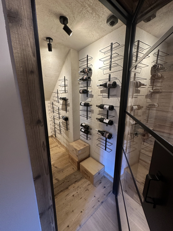L’intérieur dévoile une atmosphère chaleureuse et raffinée, pensée pour le confort et la convivialité. La pièce de vie, généreuse et élégante, accueille une cuisine semi-ouverte, un espace repas et un salon sublimé par une cheminée, véritable cœur du chalet. Les espaces nuit se composent de cinq chambres, dont quatre en suite, offrant intimité et confort à chaque invité. Un salon TV, une cave à vin vitrée et de nombreux rangements viennent parfaire l’expérience.