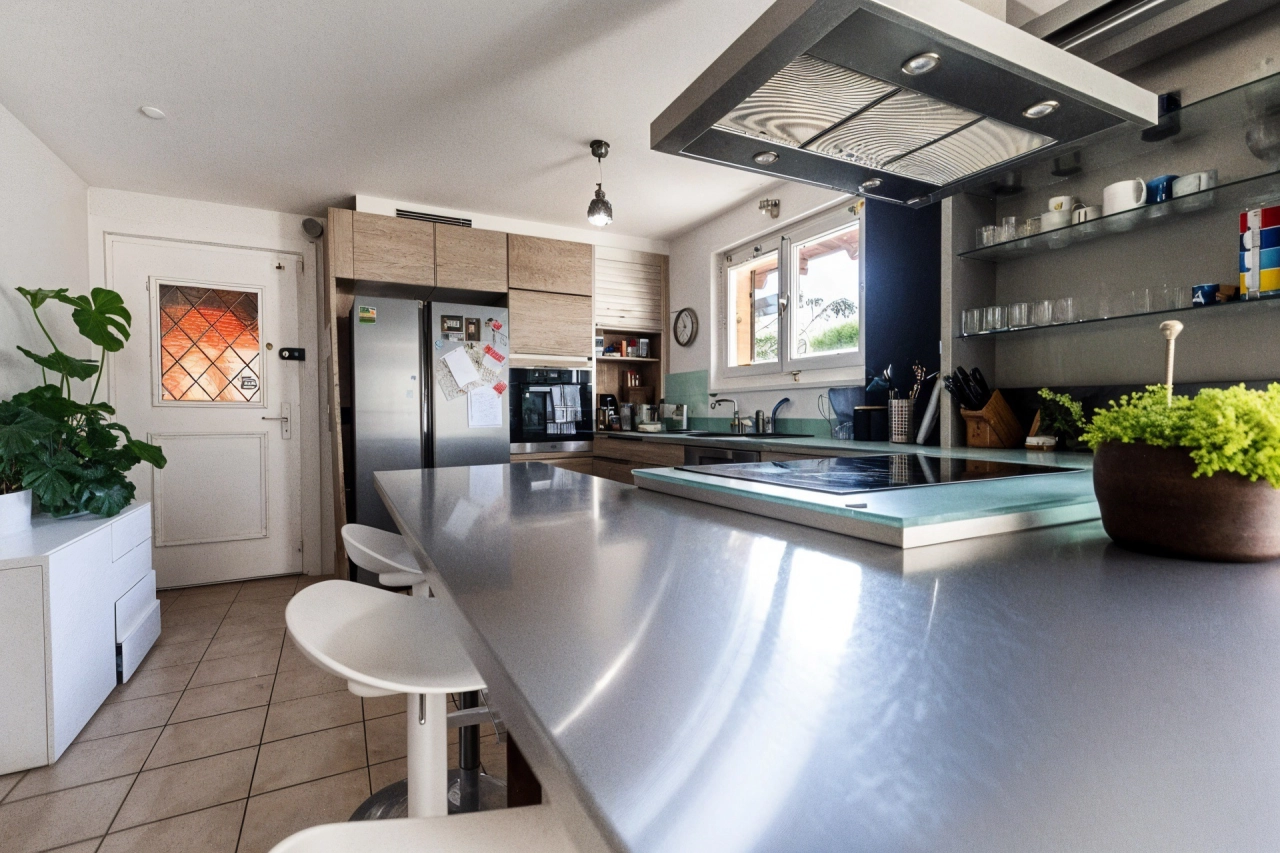 Une belle pièce de vie conviviale, organisée en salle à manger et salon, s’ouvre directement sur le jardin et sa terrasse, prolongeant l’espace vers la piscine et son salon d’été sous tente. Une grande cuisine ouverte, entièrement équipée, invite aux moments gourmands en famille. Un WC visiteurs complète ce niveau.