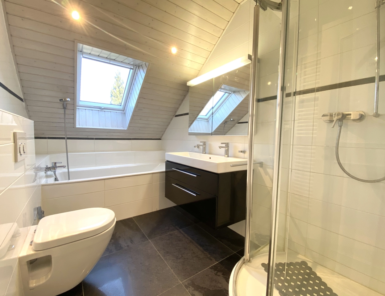 Salle d’eau avec baignoire, douche, WC et double vasque