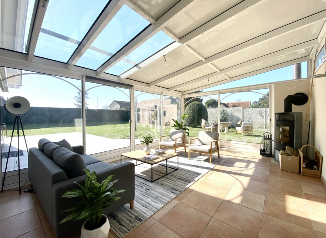 Véranda de 24 m² avec poêle et stores extérieurs électriques