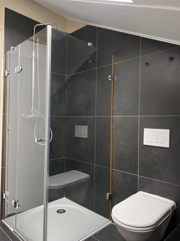 d'une chambre avec armoires encastrées et salle de bain, d'un bureau ou chambre d'enfant, d'une salle de douche ainsi que de deux balcons.