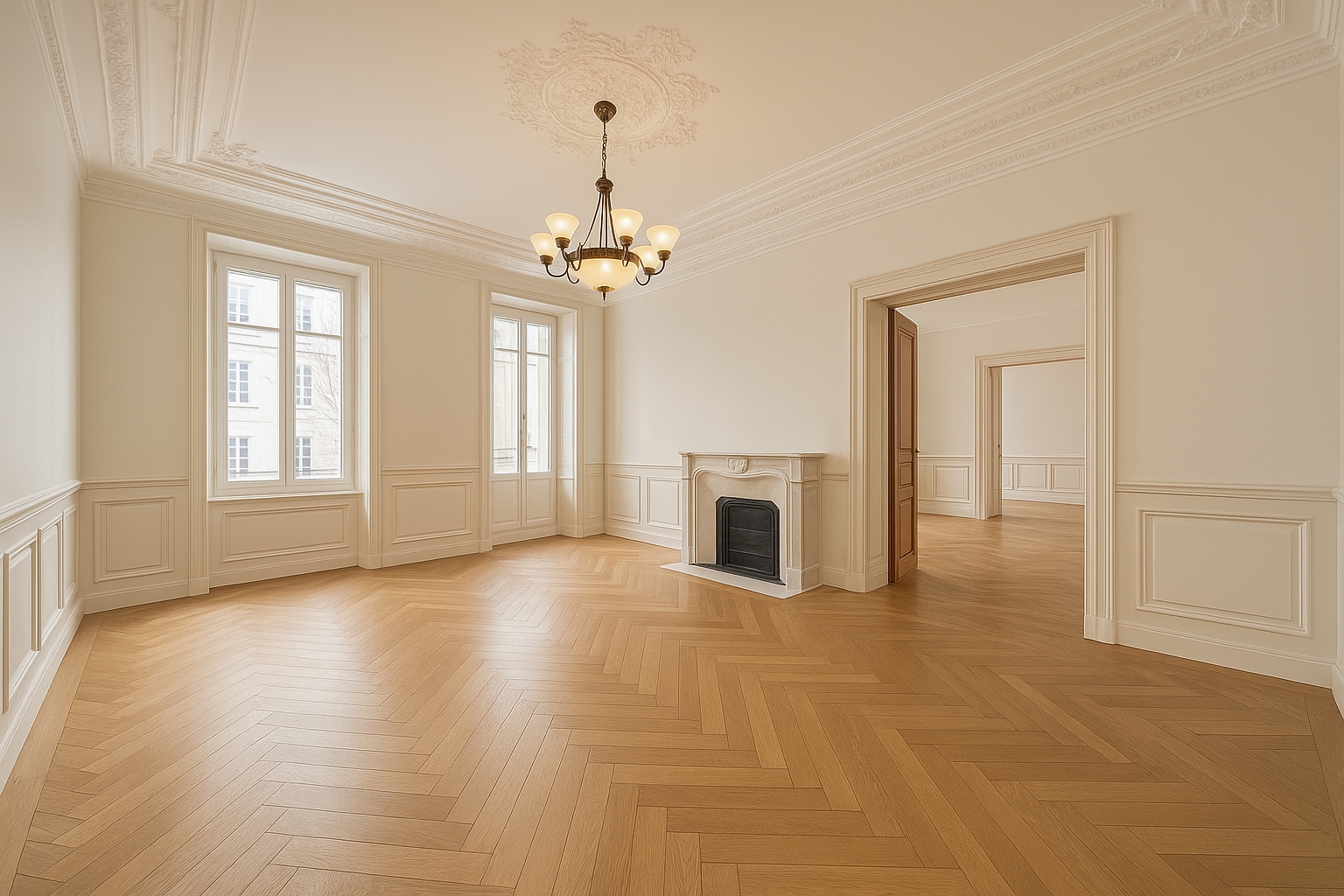 Finitions haut de gamme — menuiseries et boiseries restaurées.